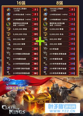E组的231 AGH联盟,F组的248 WAT都来自台湾,他们也都拥有不俗的实力,这次都即将和中国大陆的战队进行对决,定是精彩非凡! 来自国内外的战队风云际会,不同的语言,迥异的文化,都在游戏的世界里沟通交流,借助游戏优秀的即时翻译系统,以及支持12种语言的高效客服团队,各国玩家将在游戏中零距离无障碍沟通,在竞技中加深友谊,这才是《COK列王的纷争》全球同服的魅力所在。 【8 强大奖闪耀公布,豪华内容无上荣耀】 除了16强对阵形势公布之外,官方还带来了更大惊喜,那就是16进8的晋级奖励,总决赛决出的冠军队员更是可以获得全球限量定制黄金胸章,至尊荣耀正在等待最强的君王,你的光辉将无人可及。