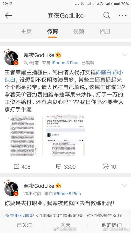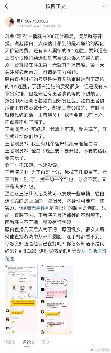 这几年随着《王者荣耀》的迅猛发展,一大批主播也跟着走红。作为其中一位的骚白,前无古人的326连胜让他赚足了眼球。 但就在近日,骚白在微博上被人实锤代打,着实让众人大跌眼镜! 骚白这位主播相信不少《王者荣耀》的玩家都认识。凭借着花木兰的极限操作闻名,一波326连胜更是让挑战者望而却步。 骚白在技术方面没得说,甚至在王者局中可以用冷门英雄甄姬带飞队友,小编看他直播时也为他的技术意识所折服,确实学到了很多英雄的打法和思路。 但也正因如此,这次爆发的事件和一直以来给玩家们的印象形成了强烈的反差,让好多人一时间无法接受。 事情起因于经常与骚白一起直播的纯白最近转会斗鱼,张馨予也在直播间里一同露面,一时间霸占了微博热搜。 就在“白家军”们四处奔走相告时,状况突然发生了:王者荣耀冠军教头寒夜转发了一篇微博,一位微博名噜噜酱的代练称自己曾替王者荣耀主播骚白代打,由于拖欠工资,自己讨要不得,在多次协商私下解决时竟被反咬一口,被判五个月监禁,现在出狱后要为自己讨要一个说法。寒夜微博底下一大批人瞬间炸锅,称此事十分不耻。 吃瓜群众们在微博下仔细分析了一波。 众所周知,骚白直播从来不露脸。但由于他的实力的确非常强,当事人出事入狱后骚白也正常直播,所以骚白直接请代打为自己直播这件事不大可能。 而和骚白一起直播的另外一名主播纯白,被爆料是骚白的亲兄弟。纯白一旦露脸直播便和平时判若两人,水平下降得厉害,这就让人不得不认真审视这次事件了。 另外,根据这名爆料者噜噜酱的说法,由于母亲得病而去索要工资,想不到却被微信拉黑、聊天记录被删,最后在私下解决时被警察发现,以敲诈勒索罪判处五个月有期徒刑。 近年来,直播界出事的大主播越来越多。前有某某开怂恿粉丝骂人,后有陈一发儿口嗨历史,这二位都被封禁处理。说实力,这二位估计能甩骚白几条街。对观众来说,一个主播技术好坏非常重要,但这些在价值观道德观面前都是次要的东西。即使你技术方面再怎么好,一但道德人品方面出了问题,等待他的只有国家和人民公正的处罚,前事不忘后事之师,无论是主播还是观众都要牢记这一点。 最后,作为一名吃瓜群众,在迫不及待想要看后续的同时,更加希望有关方面能够重视这次事件,制定一个圆满的解决方案,给当事人,给观众们一个合理的交代! |